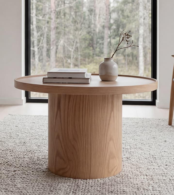 שולחן עגול מעץ אלון גושני במראה סקנדינבי קלאסי.